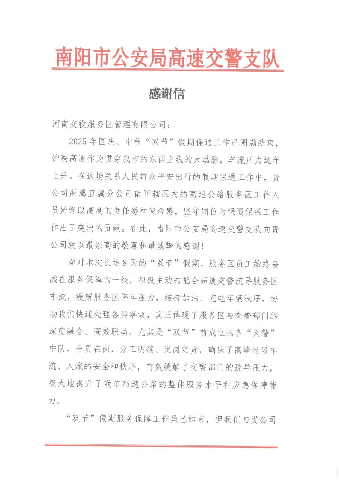 《一封感謝信 濃濃服務…》 10月10日,南陽市公安局高速交警支隊向公司所屬直屬分公司寄來感謝信,表達對南陽轄區內…